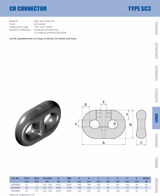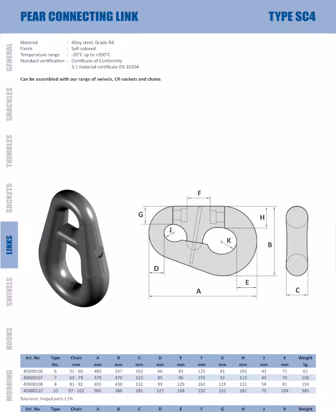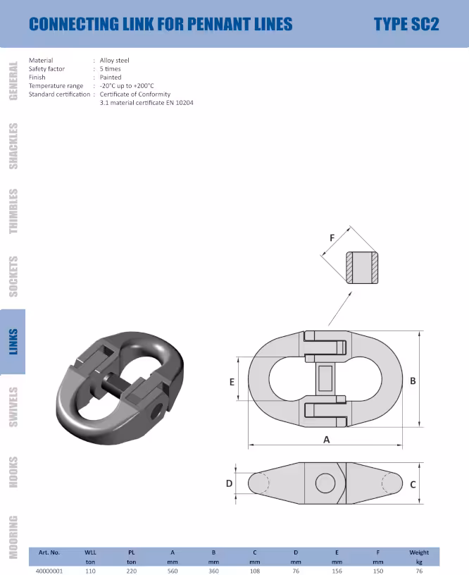Designed for 1 to 4 leg lifting systems and anchor legs, our links provide reliable load distribution. This section covers Master Links (SC1) and Master Link Assemblies (SC5) forged from alloy steel with safety factors up to 5:1. For offshore specific needs, the Offshore Master Link (SC11) is engineered to meet stringent yield strength and hardness requirements for the harshest environments.